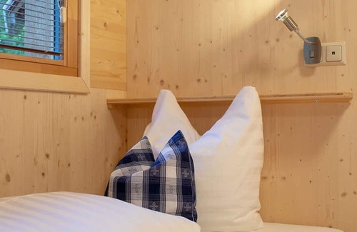 "Glamping Lodge B", 2-room mobile home 33 m2. Object suitable for 2 adults + 2 children. Cosy and wooden furniture furnishings: living/dining room with dining table, kitchen corner and satellite TV (flat screen). Exit to the terrace. 1 double bedroom. Gallery with 1 double bed. Kitchenette (oven, dishwasher, 2 ceramic glass hob hotplates, kettle). Shower/WC. Heating. Parquet floors. Terrace furniture. Facilities: hair dryer. Internet (WiFi, free). Instead of an enclosed bedroom, some sleeping areas are located in an open-plan area (gallery, alcove, etc.).