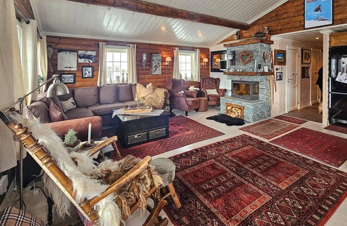 Your beautiful holiday home invites you to take a relaxing break in the midst of Norwegian nature. Look forward to an interior full of charm and traditional atmosphere. Make yourself comfortable in the spacious living room, which is equipped with comfortable furniture, wooden beams on the ceiling and a fireplace. Spend evenings together at the dining table, enjoy cosy movie nights in the separate TV room or relax with good conversation on the spacious sofas.