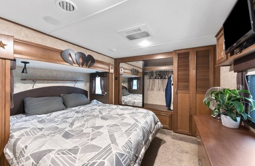 Our RV camper offers a comfortable and contemporary living space. The queen bed provides a restful night's sleep, while the rollaway bed is ideal for an extra guest. The interior is thoughtfully designed with ample amenities to ensure a pleasant stay.