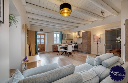 Welcome to “Le Nid des Fontaines”, a warm and refined 60m² apartment located on the first floor of a fully renovated traditional Savoyard farmhouse. This cozy retreat combines the charm of authentic architecture with modern comforts, all nestled in a peaceful setting just steps from the shores of Lake Annecy.