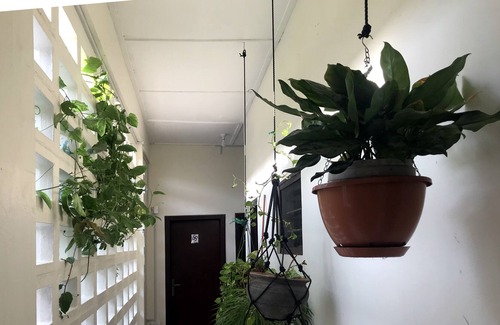 This room has a queen-size bed with orthopedic mattress, cupboard space, a laptop-friendly desk, and more. The bathroom, with hot, high-pressure shower, and the kitchen are shared with one other guest.