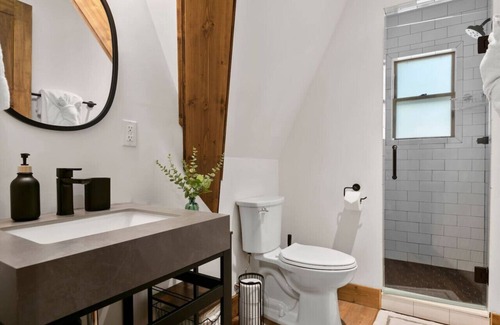 ✨ Retreat to one of the bedrooms for a good night’s sleep, each with a view of the woods and fully stocked with extra towels and linens. Each bedroom has a smart TV for your entertainment and gaming needs. The queen bedroom is located on the main level along with a full bath with large tile shower. On the second floor you’ll find the master bedroom featuring a king-sized bed, perfect for a cozy Sunday brunch, and a full bath with a large, tiled, walk-in shower. You’ll also find a third bedroom with 2 twin beds. We even provide you with toiletries.