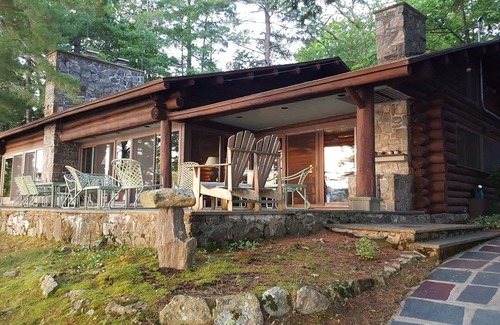 Private Adirondack waterfront home at the end of Pilot Knob Road on Lake George’s eastside. Sleeps up to 12 with 5 bedrooms, a bunkhouse and 3 baths. Main house house 2 bathrooms and 4 bedrooms for up to 10. Master bedroom has incredible lake views through wraparound sliding glass doors. The second bedroom on the first floor sleeps 4 with 2 single beds and a bunk bed. Two bedrooms upstairs with king beds, vanities and sinks. Private apt off the garage has a ¾ bath and queen sized bed. The entire lake-side of the home is enclosed by sliding glass doors, providing incredible panoramic views of the lake. The view can be enjoyed from the home’s kitchen which has two convection ovens, two refrigerators, a stove top, a microwave, a dishwasher and a large wooden-block center island . The kitchen is open to a dining room that can seat up to 12. A stone terrace runs along the entire lake-side of the house and is perfect for outdoor meals or cocktails. A short stone walkway leads to the large dock with lounge furniture for sunning and relaxing. The dock provides access to a shallow end and a deep end. Water enthusiasts will enjoy two single person kayaks. The dock slip is available for a boat. A private tennis court just out the back door with judges chair and chair seating for an audience. The home also features an original, built-in bar with bar stools and benches. There is a washer and dryer in the main house, sheets only will be provided. Bring your own towels!!! ADDITIONAL FEATURES: hammock, Weber grill (gas), basketball hoop in drive way (bring a ball!), outdoor furniture on terrace and dock, card table, fire pit. walk to the trailheads for both Buck and Pilot Knob Mountain, 40 minutes from the Saratoga Race Track and SPAC.