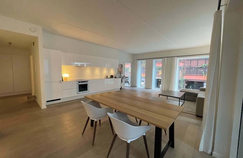 The apartment features a spacious open-plan living area, a fully equipped kitchen for shared meals, and comfortable bedrooms designed for restful nights. Floor-to-ceiling windows fill the space with natural light and showcase the modern charm of Nordhavn.