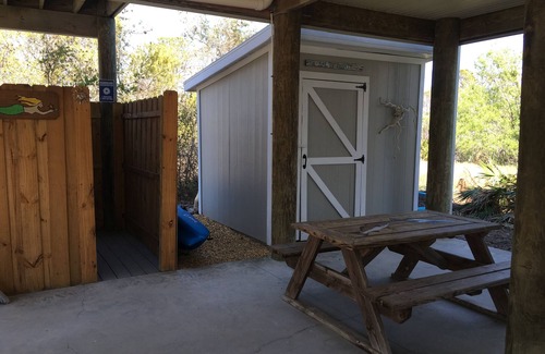 Storage shed behind the house contains beach chairs, beach cart, etc. for use during your stay. There is also an outdoor shower available. Well behaved dogs (max of 2) allowed with prior approval and $50 pet fee. Pets should be up to date on flea/tick meds. There is wifi and Roku TV available for your indoor entertainment needs.
