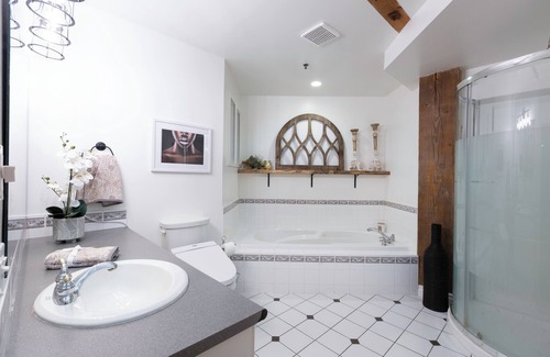 This spacious NYC style warehouse loft is centrally located downtown in Regina’s Warehouse District. This unique style of condo offers hardwood floors, original wood beams, exposed brick and incredible 10’ ceilings. In this condo you will find a pool table, foosball table, darts and a collection of board games for all your entertainment needs. If you’d rather kick back and relax this space has you covered, just fill the jacuzzi tub, turn on the fireplace and cozy up on the 25’ sectional!