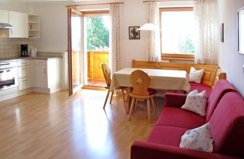 "Obermüllerhof", 4-room apartment 75 m2 on 2nd floor. Bright, practical furnishings: large living/sleeping room with 1 double sofabed, dining nook and TV. Exit to the balcony. Living/dining room with dining nook and kitchen corner. 2 double bedrooms. Open kitchen (oven, dishwasher, 4 ceramic glass hob hotplates, kettle, electric coffee machine). 2 showers/WC. Heating. Balcony. Balcony furniture. Facilities: children's high chair. Internet (WiFi, free). Please note: non-smokers only. Private entrance.