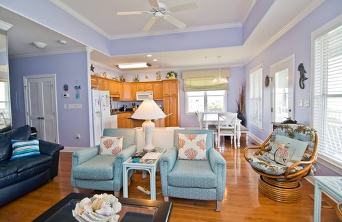 The Living Area has a 47 inch HDTV with DVR and a DVD player and provides more of those gorgeous sound views. With Bedroom #1 with King Bed, TV, Private Bath with Double Vanity, Tub and Shower; Bedroom #2 with Queen Bed, TV, access to Shared Bath; and Bonus Room with Twin over Double Bunk, TV, access to Shared Bath, there is ample opportunity for restful relaxation!