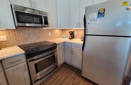 The top-floor grand master suite is your private haven, featuring a king bed with an ensuite bath with a double vanity, and a stand-up shower. A convenient laundry room with a stackable washer and dryer is also located off the master suite. A few steps down, you'll find the guest bedroom with a comfortable queen bed and a shared bathroom.