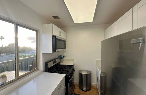 Enjoy amazing views and golden sunsets on a huge deck overlooking the Pacific Ocean and Catalina Island. This bright, renovated studio features big windows and the best of beach living. Close to the world famous Woods Cove Beach, you are just steps from the sand, restaurants, cafes, stores, and nightclubs. Air conditioned. Heated. Free access to the washer and dryer in the building. Furnished cleanly with Queen bed, sofa chair and modern furniture.