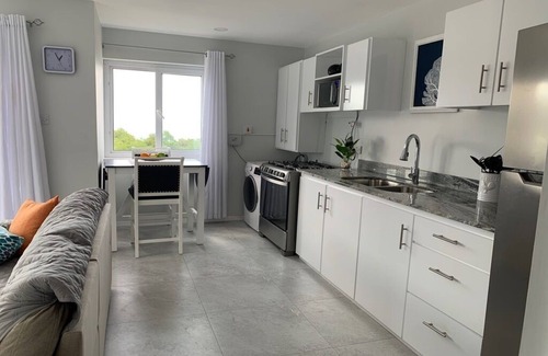 Unit 1 is located on the upper floor and the size is 440 square feet with a balcony and a patio set. The condo is bright and breezy. Condo is an end unit and includes an additional window in the living room for extra natural light and an enjoyable cross breeze. This unit has 1 bedroom with a queen size bed and 1 bathroom with a glass enclosure and rainfall shower. There are 2 air conditioning units in the bedroom and living room areas. The living room has a small L-shaped couch, coffee table and 43” smart TV, cable and a ceiling fan. Free WIFI is also available. The fully equipped kitchen has a fridge, gas stove, microwave, kettle, blender, toaster, and coffee maker. The kitchen is bright and modern with white cabinets, quartz countertop and the floor are porcelain tiles. The condo is equipped with a washer and dryer combination unit for your convenience.