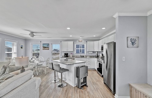 The top floor of the home provides ample room in the open and inviting living space. This living space offers a 65" smart TV with a sound system for family entertainment. The spacious kitchen provides plenty of countertop space and updated appliances, as well as access to the balconies for the sound or beach side. The kitchen is well stocked with a coffee bar for your morning energy as you watch the sunrise over the beach. There is a tea bar for you to enjoy as you relax in the evening sitting on the back deck watching the sunset. Off the living room sits a bedroom that has a Queen bed and a 45" smart TV, with a shared full bathroom.