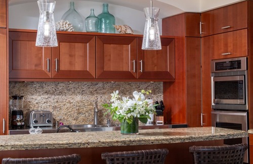 The alfresco panoramic ocean view veranda has a stainless Viking gas grill, an outdoor dining set, and outdoor lounging furniture. The kitchen is extremely well equipped and is complete with a power juicing machine, espresso machine, dual coffee makers, coffee grinder, waffle maker, toaster oven, toaster, mixer, food processor, hot air popcorn popper, rice cooker, tea kettle, spices/herbs, assorted coffees, a full set of cookware, service ware, small devices, and other conveniences. The kitchen has plenty of room to store your groceries, as well as two separate refrigerated beverage drawers, double freezer drawers, two Sub-Zero refrigerators, built-in microwave, convection range, Bosch dishwasher, and a ceramic glass Ceran cooktop.