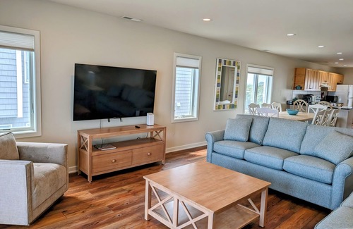 Sleeping arrangements comfortably accommodate up to 12 guests with a king and queen suite on the 1st floor, a king and two twins suite on the 3rd floor, and a queen sleeper sofa in the living room. There is also a private queen suite on the ground floor. The home features five full bathrooms plus one half bath for convenience.