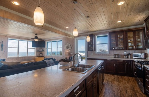 Fully outfitted Kitchen upstairs and Spacious Living Room with Oceanfront Deck, a large 12 person Dining Area and 2 adjacent upstairs Master Bedrooms.