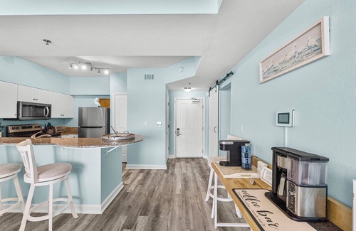 Inside, enjoy a stylish, comfortable space with coastal appeal! Right inside, you'll find well-decorated living quarters and every amenity you need to make your vacation great! A well-equipped kitchen featuring stainless steel appliances, granite counters, and a coffee bar. Dine indoors or on the spacious balcony with sweeping Gulf views. The living room has a large smart TV for streaming your favorite channels!