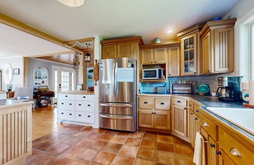 The house is open and spacious, with oceanfront views filling the inviting living room. There's a well-equipped kitchen with stainless steel appliances, a dining room table for family dinners on cool evenings, and a wood-burning fireplace to warm you as you stream nightly movies. There's also a classic, casual family room downstairs, complete with a fun wet bar. High-speed WiFi and a private washer/dryer are provided for your comfort as well.