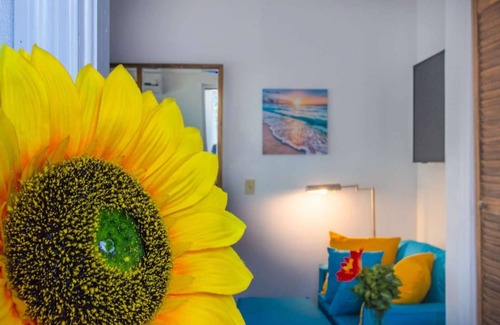 You will enter the Apartment through the yellow entrance door and find yourself in a fully equipped open Kitchen with a small dining area. Two steps down are the Bedroom with a closet and view to the Garden area of the Main house and the Ocean. The Bathroom has a walk-in shower and everything you will need.