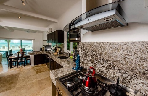 Situated on Soliman Bay in the Tulum area of the Riviera Maya, this tranquil 6 bedroom, 6.5 bath home provides every imaginable amenity in an unparalleled setting. The fully updated main house includes ample living and dining space with gorgeous marble floors, a 65” plasma TV, unique onyx dining table, and fully retractable sliding doors for full enjoyment of the sea breezes. A convenient half-bath holds a unique decorative standing sink with a fountain-style faucet. The well-equipped kitchen includes granite counters, a commercial oven and stove, spacious refrigerator, deep fryer, and all cookware and tableware. The master bedroom includes a king-sized bed, en-suite bath with lit white onyx sinks, and a luxurious fully furnished balcony overlooking Soliman Bay. The main house guest room contains a queen-sized bed and its own en-suite bathroom with marble, granite and onyx finishes. Head upstairs to the roof terrace to take in the panoramic view of the sea.