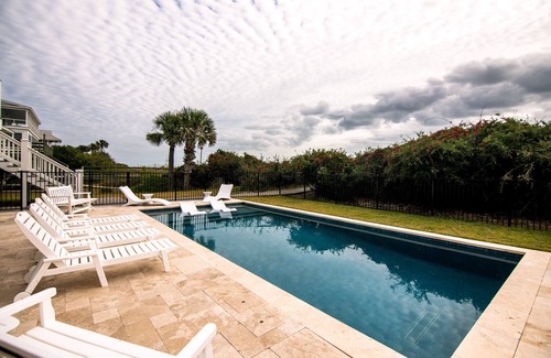Enjoy the best vacation you've ever experienced in exquisite Edisto luxury at Four Seasons (7BR/7.5BA; 4K, 4Q, 2S; Sleeps 18). Incredible sunsets and breathtaking panoramic views await you in this spacious, beautifully decorated, beachfront showplace located in the desirable Point Street area overlooking the Atlantic Ocean. No picture will ever be able to do justice to the famous sunsets that will be on display every evening from multiple verandas as well as the sundecks accessible from the dual master suites on the second floor. Enjoy your morning coffee or an afternoon cocktail as you kick back and unwind watching pelicans fly in formation while the breeze carries in the sound of the waves. If you've been to Edisto before, you know that the relaxation found here is unparalleled. From the moment you enter, you will see that no detail has been overlooked to ensure your comfort including a 3 stop elevator. The gourmet kitchen features granite countertops, ample storage, 2 dishwashers, 2 wall ovens, and a 5 burner cooktop to ensure your friends and family are entertained in style! Cable TV and free internet access are available if an afternoon shower interrupts your sunny day on the beach. After a hot day on the sandy beach, take a dip in the private pool. Splash and play as the days turn into cool, sweet evenings. Magnificent hardwood floors, high ceilings, and exceptional furnishings will ensure that Four Seasons becomes part of your family's most exciting traditions.