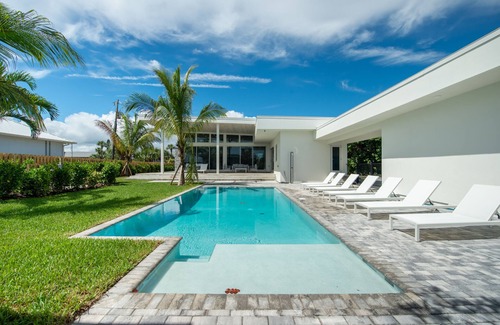 The backyard overlooks the blue waters of the Atlantic Ocean and its white sandy beaches.