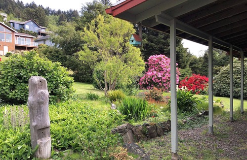 The Green Frog is a fully equipped home surrounded by rhododendrons and beautiful landscaping. The coastal beauty can be peacefully observed through the large picture windows and no matter what direction you go when you step out of the door, you'll be able to indulge in the many gifts that the coastline has to offer.The beach is a quick 4.5 minute walk for all of the whale watchers, beach comers, wave gazers and nature lovers.