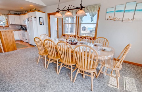 OCEANVIEW Rodanthe - Sea Oats Dr. - SANDY BRITCHES is full of surprises for your next vacation. Take a dip in the private pool or stroll to the easy beach access only 4 lots away. When you are done at the beach, stow your gear in the large lockable storage area. Inside the home, enjoy a round of pool in the game room on the pool table that also flips to become a poker table. A convenient full bath is available for quick trips in from the pool or beach. The mid-level hosts three bedrooms, one is a king master with private bathroom and slider access to the covered deck. The other two bedrooms (queen, pyramid bunk) share a bathroom between them. The indulgent hot tub is located on this level's covered deck. Upstairs, find one more king bedroom with semi-private access into a full bathroom shared with the great room. The well-appointed kitchen provides a comfortable location for preparing the days' meals which can be served in the dining area or in the furnished screened porch with water views. Revel in an island sunrise or sunset from the wraparound deck with ocean and sound views. With amenities like this, you'll want to be in SANDY BRITCHES every year.