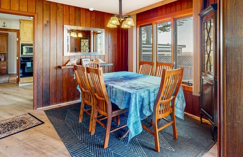 Sitting at the north end of town, this gorgeous, four-bedroom Mendocino vacation rental is comprised of a main house, a charming guest cottage, and an inspiring artist's studio, all of which offer beautiful ocean views, a landscaped yard brimming with colorful rhododendrons and a variety of coastal flowers, a gas fireplace in the main house, plus two full kitchens and a kitchenette for your convenience. Right from the decks, you'll have dramatic views of Agate Cove and the Headlands — the perfect scene for a relaxing afternoon glass of wine or a summertime cookout with the family.