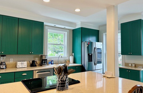 Upstairs, you'll find three additional bedrooms—two with queen-size beds, and one that serves as a beautiful master suite. This spacious king bedroom features its own newly remodeled en-suite full bathroom, offering added privacy and comfort. All bedrooms on the second floor are equipped with air conditioning to ensure a restful night’s sleep. This level also includes another full bathroom, as well as a relaxing sitting area with a large-screen TV and a Peloton bike for guests who enjoy staying active.