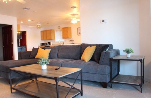 The riverfront rental is in a quiet family neighborhood, perfect for that family vacation. The house is located on main-channel rare deep-water in Holiday Shores. The house has a private dock on the river. As you step down to the river, the area is covered in river-rock creating a private river-pool. With two covered patio decks you will have plenty of space in the shade to enjoy the Colorado River panoramic views. The downstairs covered patio is over 1,500 s.f. overseeing the river. The patio has plenty of seating, including outdoor dinning table, chairs, an outdoor sectional couch and a BBQ grill.