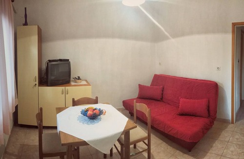 Apartment can accommodate 3 guests. Beds are situated in 1 sleeping rooms, but also in the dining room, within 30m2. Guests can use a private balcony to enjoy the warm summer evenings. The apartment offers the sea view. Food can be prepared using barbecue which is shared with other guests too. This accommodation unit welcomes pets at an additional charge. Reserved accommodation unit has a shared terrace.