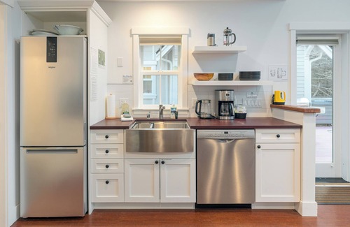 The cottage includes two buildings, each sporting a bedroom with a queen size bed and 3/4 bathroom. Step inside the main room of the primary building where the fully equipped kitchen includes everything you need to prepare meals sourced from the excellent local grocery stores and farmer’s market. At the other end of the room, grab a book from the shelf and kick back in the recliner for a good read. Though it gets chilly at the top of the mountain year-round, you can take the chill off the room with the freestanding propane stove.