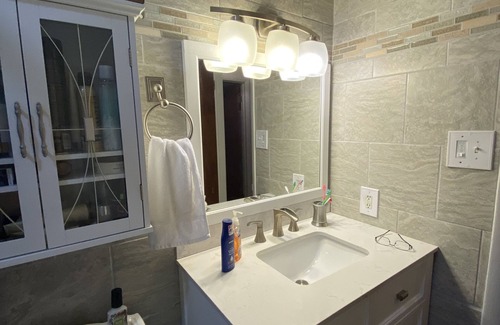We love our home and know you will too. We have recently remodeled the kitchen with new granite countertops, new appliances including front load washer and dryer, double oven stove, microwave and dishwasher all in stainless steel. We have also updated the kitchen sink to a farmhouse sink and new white cabinets have been installed. The bathroom, too, has been updated with ceramic tile on walls and floor, a rainshower head with fantastic water pressure, and new vanity. The lighting in the ceiling also has blue tooth to listen to your favorite music while relaxing in the bathtub. There are 2 bedrooms, one with a king size bed and one with a queen size (the queen bed is an adjustable bed with memory foam mattress) and there are TV's in both rooms. There is also a large curved TV in the living room for your enjoyment.