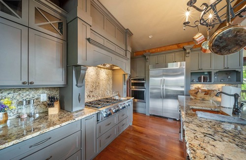 This Adirondack custom-designed home features natural design elements throughout, including gorgeous hardwoods shadowed by massive, rough cut cedar timber frame construction. Lavish mountain décor and regal furnishings, highlighted by impressionist style artwork, blend seamlessly together for a true rustic elegance. The Great room boasts a grand, tongue and groove lined cathedral ceiling and floor-to-ceiling stone fireplace and TV tastefully tucked into the hutch nearby. The space is free-flow to the gourmet kitchen, which is equipped with stainless appliances, exquisite granite counter tops and backsplash, ornate custom cabinetry and bar seating. The formal dining area is just steps off of the Great room and kitchen and looks out onto expansive ridgeline views. Step out to the abundant covered outdoor living and dining space, with built in gas grill and fireplace, and take in the amazing vistas and clean mountain air.