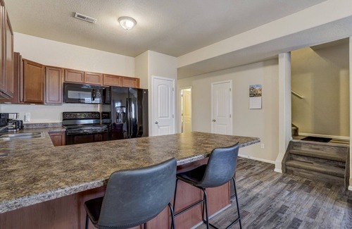 Welcome to this expansive retreat with 3 bedrooms and 2 bathrooms, perfect for up to 6 guests. The open-concept living area blends productivity and relaxation, offering high-speed Wi-Fi, a cozy living room, and a smart TV for unwinding. The fully equipped kitchen has everything you need to whip up delicious meals. Savor your morning coffee or indulge in an evening glass of wine on the private patio, immersing yourself in breathtaking mountain views of Pikes Peak and the Cheyenne Mountain range. Get ready for a rejuvenating stay!
