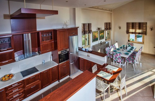 An open marble staircase (eight steps) leads to upper floor where is a very well equipped kitchen with full electric cooker, electric oven, microwave, dishwasher, fridge/freezer, coffee machine, toaster, juicer, and electric kettle. In the same level of the kitchen there is the dining room with a big dining table for 12 people.