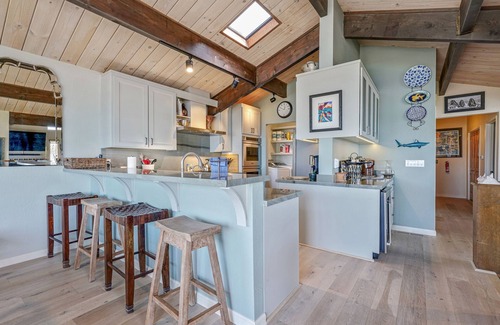 Our home is tastefully decorated in a "beachy" way, including original artwork from local artists and many fun knickknacks. The living room features magnificent ocean views from every window, a wonderful spa fireplace, and a 65 inch HD TV.