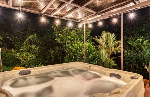 This Guest condo is located on the second story with the ground-level entrance of our primary residence. We occupy the top floor of our three-story home. This suite is very spacious and bright at nearly 800 square feet. Hillsides surround us, and our trees are full of life, including all manner of birds. Parrots, parakeets, hummingbirds, oropendula, and tucans. At night, the jungle comes to life with the sounds of frogs and other nocturnal visitors. We include the use of our hot tub on the rear balcony in your reservation. You have access to the hot tub on an exterior staircase that is found outside your kitchen entrance.