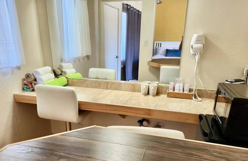 This listing if for Unit 7, located on the second floor of our building; it comes with a private kitchenette, bathroom, and patio (all pictured). The kitchenette is equipped with a mini refrigerator, freezer, microwave, and coffee maker! The unit is also equipped with black out curtains, TV. The restroom comes with extra beach/pool towels, hair dryer, shampoo, conditioner, and shower gel. The hosts will be on or nearby the property (in another distanced unit) in case guests need anything like additional linens, pillows, etc. Guests registered to stay in this room will have complete access to our other facilities, including the mineral hot tub, pool, and barbecue facilities.