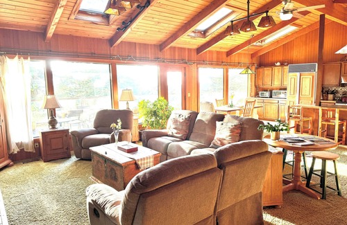 Come enjoy spectacular ocean views from every room, sunsets over the islands, spacious deck, and hot tub. Our centrally-located classic PNW wood-paneled home nestled among Doug Fir trees is