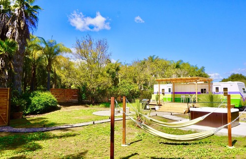 Paradise Ranch in Fallbrook, CA is the perfect destination for a getaway in wine country. The trailer is a slice of paradise: an incredibly private property with amenities including a hot tub, fire pit, hammocks, propane grill and a huge outdoor lounging area . The inside has been designed for optimal comfort and relaxation. We have a fully stocked kitchen, fast wifi, televisions in the main space and bedroom, board games galore and everything you need for a unique, fun and peaceful stay.