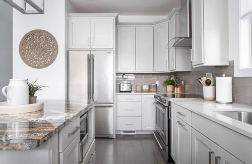 Full modern kitchen with granite countertop seating. The master bedroom has a king bed and ensuite bathroom and walk-in closet. The 2nd bed room has a queen bed. There is a 2nd full bathroom, and a full capacity stacked washer and dryer in a laundry room. The pullout sofa in the living room allows sleep-space for 2 more guests. All the convenience, all the style you'd hope to find for your TC stay.