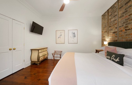 Each guesthouse is thoughtfully designed, blending historic architecture with modern luxury. Guests enjoy premium amenities, including Nexxus shampoo, blackout curtains, top-rated linens, and access to a beautifully landscaped courtyard with ample outdoor seating. Secure on-site parking for up to 5 vehicles adds an extra layer of convenience, a rarity in New Orleans.