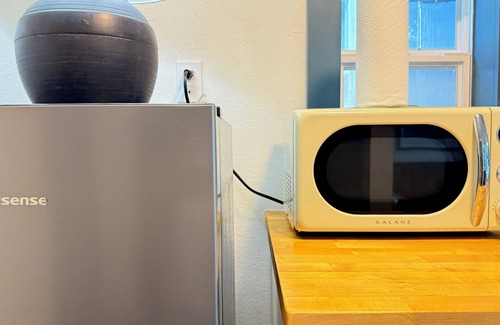 🍴 Compact kitchenette: full-size fridge, microwave, toaster oven, coffee maker, dishes, and a small dining table for two.