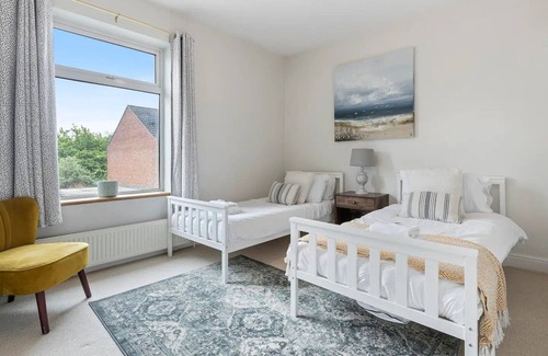 The front bedroom is delightfully arranged with two single beds, perfect for kids or additional guests.
