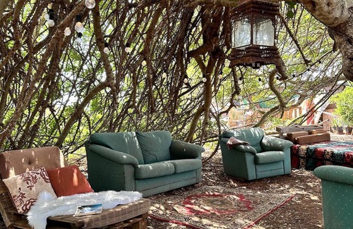 De bijenkorf: Een plek onder de bomen met meubilair, perfect om een boek te lezen of een siësta te houden als het te warm is!
