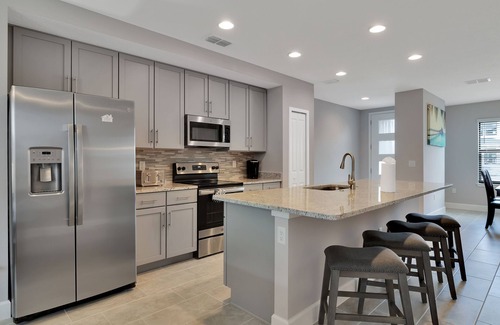You have arrived in the "Vacation Capital of the World" and you're going to love staying in our luxury, 3 bedroom, 2.5 bath, fully equipped vacation townhouse rental situated near DisneyWorld, Universal, Seaworld and Lagoland theme park attractions. There is also the new third Universal theme park "Epic Universe" has officially opened to the public. The property rental is located within the gated resort community at Terra Esmeralda in Kissimmee Florida. Our holiday rental has a full kitchen, washer and dryer, cable with 55 and 50 inch TVs, Blue Ray DVD player, wireless internet, A/C, sleeps 4-8 and all table lamps support USB connections to recharge your electronic devices. You'll find all the necessary cooking utensils and dishes for eight, dishwasher, microwave, electric range / oven, Keric and Regular Coffee Maker, refrigerator with ice maker. There is a Virtual Tour option available for your convenience.