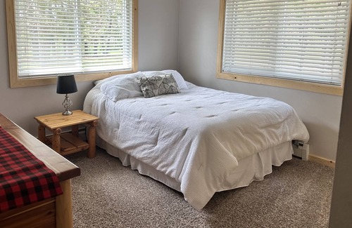 This home offers four bedrooms on two levels and can sleep up to eight with four queen beds. You can watch the sunset on the back deck overlooking the large yard, or enjoy your evening next to a warm fire in the fire pit. The property is in a quiet area but is also close to many area attractions, lakes, and ski trails. Plenty of parking for vehicles and toys.