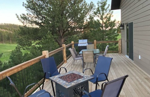 Situated on 5 acres overlooking Sydney Creek, this getaway provides the perfect amount of privacy with the convenience of being close to everything. We like to let nature do it’s thing, so most of the acreage is left un-mowed. This promotes a healthy habitat for the birds, deer, and other wildlife that frequently visit the property. The night skies are perfect for stargazing and the Northern Lights have been viewed from the house during winter. Beautiful, mature pine trees surround the back-side of the house, and the deck features views of iconic landmarks such as the Needles and Black Elk Peak.
