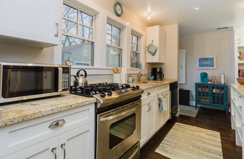 Everything you need & more! Cozy, gas fireplace,fully-stocked kitchen,privacy- fenced backyard w/awesome fire pit, comfy beds/bedding, front and back porch/deck and patio with gas grill, 2 car private parking, strong WIFI, dedicated work space, smart/streaming TVs in 3 rooms, games, bikes, lots of beach gear & wagon to pull it all!